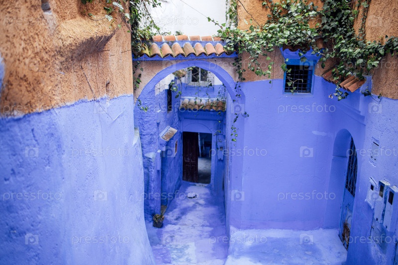 Ярко-синяя аллея, украшенная пышной зеленью, показывает текстурированные стены и очаровательную архитектуру, создавая привлекательную атмосферу для исследования и открытия