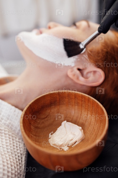 Женщина с рыжими волосами, получающая лечение лица в спа-салоне рядом с деревянной миской крема, демонстрирует расслабление и самообслуживание в спокойной обстановке