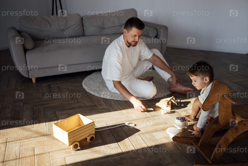 Отец и маленький сын играют вместе на деревянном полу в светлой гостиной, окруженные игрушками, создавая теплую и привлекательную семейную атмосферу для качественного времени