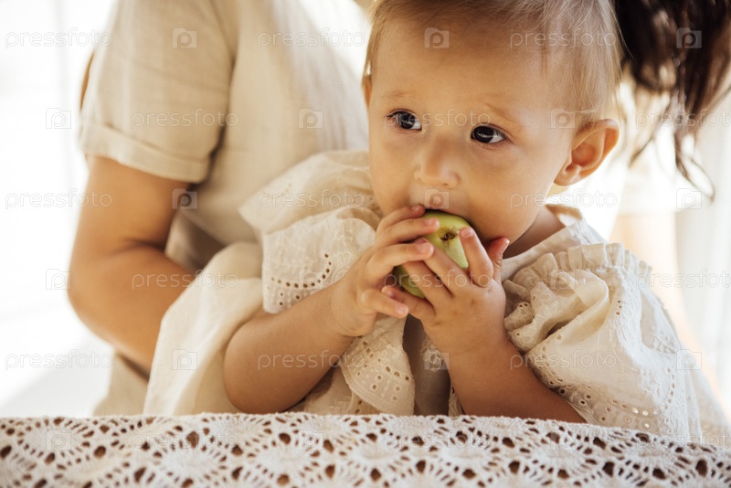 Маленький ребенок с светло-коричневыми волосами, одетый в белое платье, сидит за столом и держит зеленое яблоко, наслаждаясь моментом любопытства и невинности в яркой воздушной обстановке