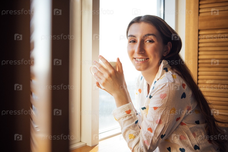 Очаровательная девушка в милых пижамах стоит у окна и наслаждается вкусным кофе. Студентка пьет чай и улыбается дома. Беспечный подросток держит чашку капучино