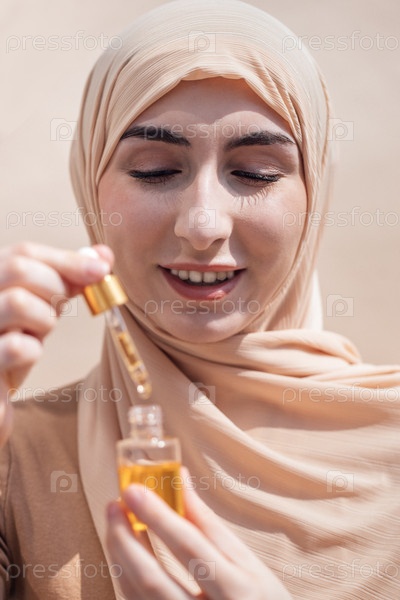Мусульманка в бежевом хиджабе держит каплю масла в руках, улыбается и показывает рутину ухода за кожей, красоту и практику самообслуживания в естественном свете