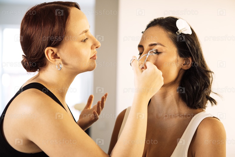 Красноволосая макияж-художница ставит ресницы на женщину с темными волосами, демонстрируя методы красоты в яркой современной студии