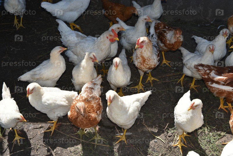 Молодые куры на ферме. Они выращивали цыплят на ферме. Птицы белые или белые и красные. У них желтые клювы и лапы. Кури ходят во дворе и пикуют все