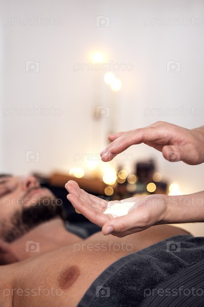 Клиент мужского пола получает расслабляющий массаж в спокойной спа-среде с мягким освещением и успокаивающей атмосферой, демонстрируя искусство исцеления и самообслуживания