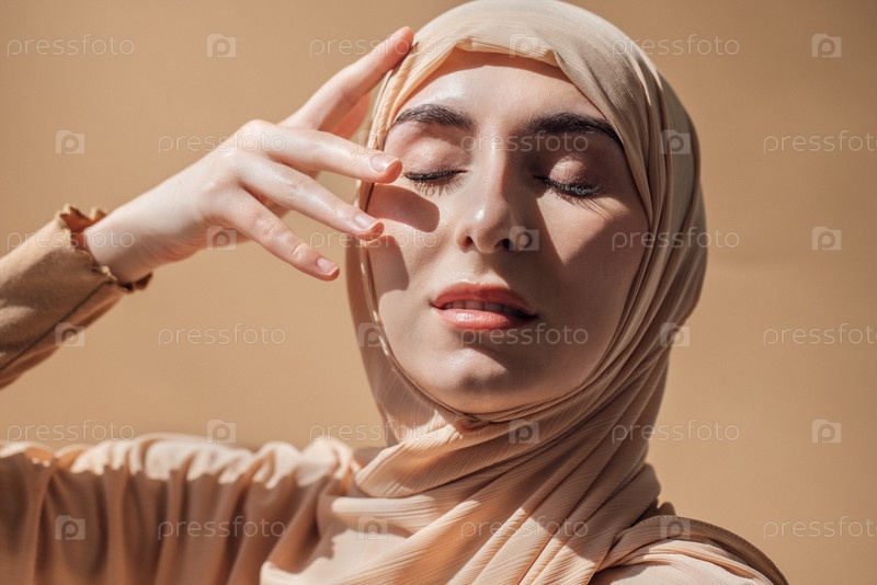 Элегантная женщина в бежевом хиджабе, мягко прикасающаяся к лицу с закрытыми глазами, показывая спокойное выражение лица на теплом нейтральном фоне, олицетворение спокойствия и грации