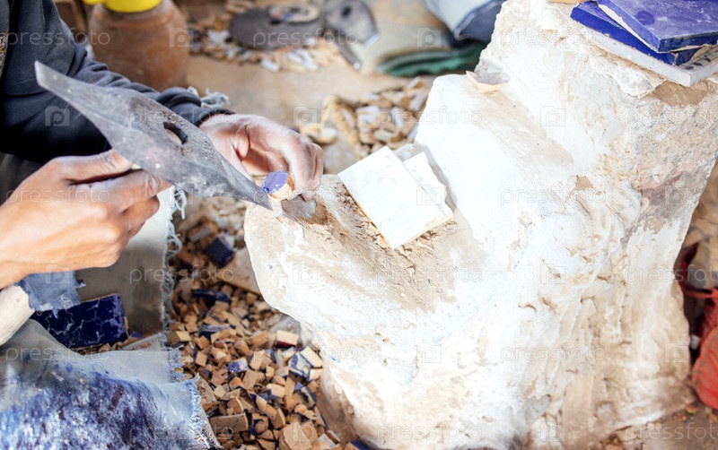 Опытный ремесленник, формирующий камень с помощью ручных инструментов, окруженный фрагментами и пылью, демонстрирует мастерство и преданность в творческой рабочей среде
