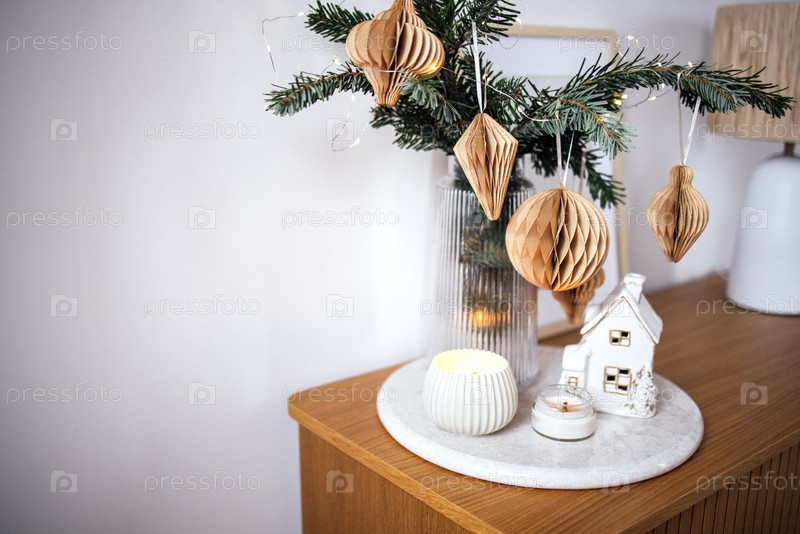 Праздничный праздничный декор с небольшой рождественской елкой, украшенной бумажными ювелирными изделиями, свечами и очаровательным миниатюрным домом, создает теплую и привлекательную атмосферу для сезонных торжеств