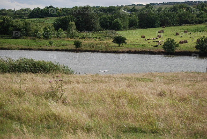 Сельский степной ландшафт. Между холмами есть небольшой пруд, в котором плавают два лебедя. На расстоянии на берегу пасутся овцы на зеленой луге. На близлежащем побережье трава отбелила солнце
