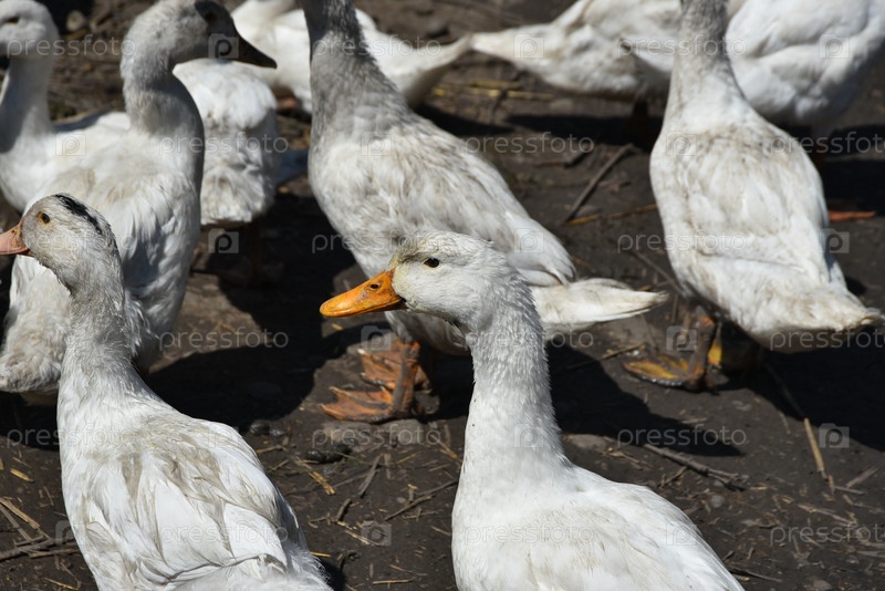 Птица на ферме.Гизз и утки на деревенской ферме имеют белое или серое оперение, желтые или красные лапы и клювы.Птицы в большом стаде пасутся во дворе, пикут зерно и воду для питья