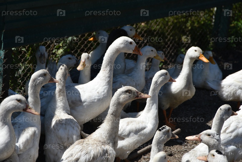 Птица на ферме.Гизз и утки на деревенской ферме имеют белое или серое оперение, желтые или красные лапы и клювы.Птицы в большом стаде пасутся во дворе, пикут зерно и воду для питья