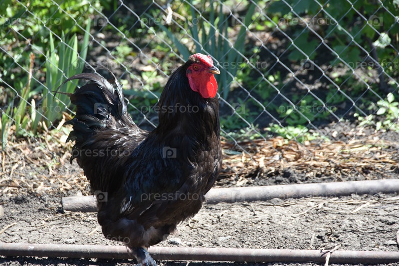 Черный петух на ферме.Птица на деревенской ферме имеет черно-серое оперение, красные глаза и желтый клюв.У петуха маленькая голова на подвижной шее и обрезанные крылья.Он ходит во дворе