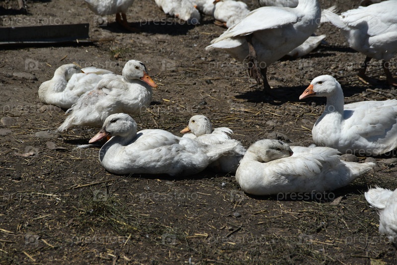Птица на ферме.Гизз и утки на деревенской ферме имеют белое или серое оперение, желтые или красные лапы и клювы.Птицы в большом стаде пасутся во дворе, пикут зерно и воду для питья