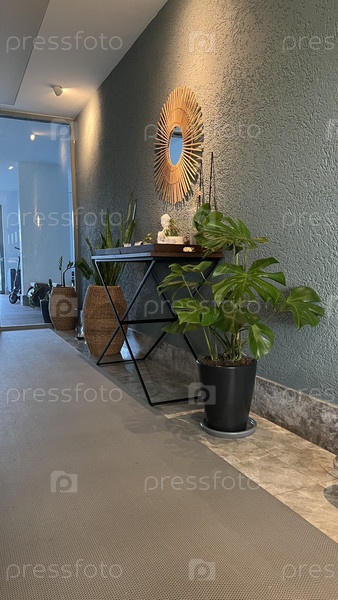 Современный коридор с зелеными растениями и консольным столом в минималистическом стиле