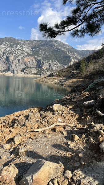 Скалистый берег горного озера с чистой водой и высокими скалами