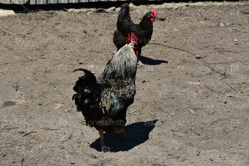 Птица на деревенской ферме имеет черное оперение, красные глаза и чёрный клюв. У петуха маленькая голова на подвижной шее и обрезанные крылья. Он ходит вокруг двора