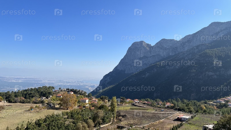 Горный склон с небольшой деревней и полями у подножия высокой скалы
