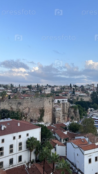 Панорамный вид на курортный город с белыми домами и черепичной крышей