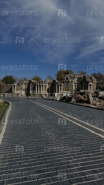 Пешеходная дорога ведет к древним руинам с колоннами под голубым небом