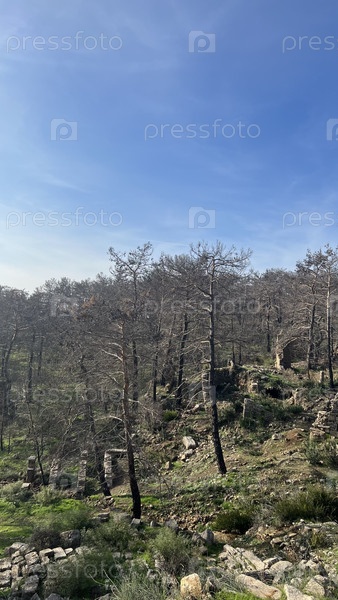 Горный склон с редким лесом и скалистой зеленой растительностью под голубым небом