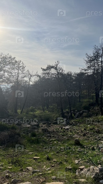 Туманный хвойный лес на склоне горы в мягком утреннем свете