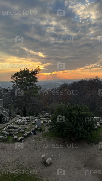 Закат солнца над древними руинами и лесом с драматическими облаками