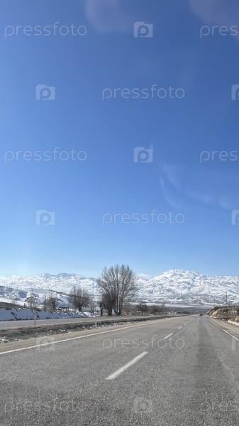 Зимняя дорога к снежным горам под чистым синим небом