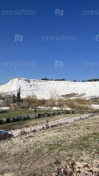 Белоснежный минеральный холм и сухой пейзаж под ярко-синим небом