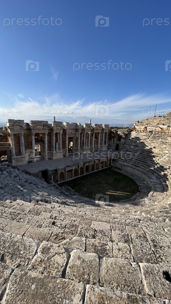 Древний каменный амфитеатр с колоннами под ярко-синим небом