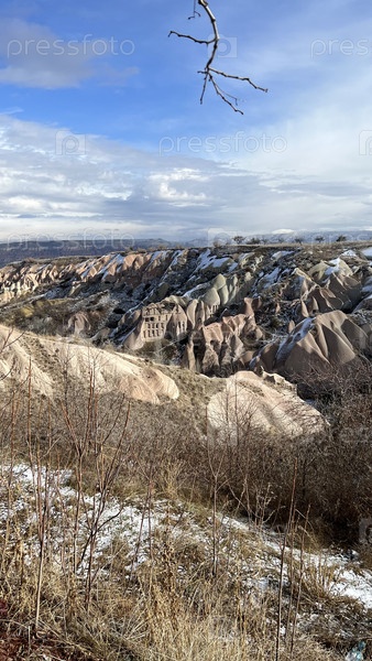 Зимний пейзаж скалистой долины с голубым небом и сухой травой