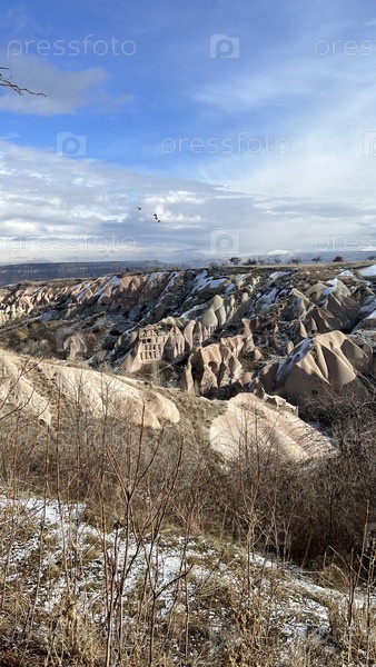 Зимний панорамный пейзаж скалистой долины с голубым небом
