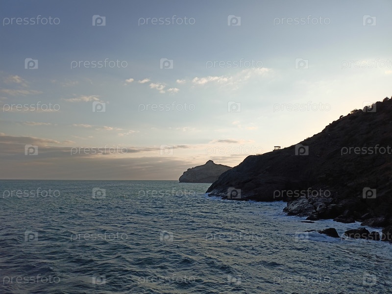 Морское побережье с скалистым мысом в мягком вечернем свете