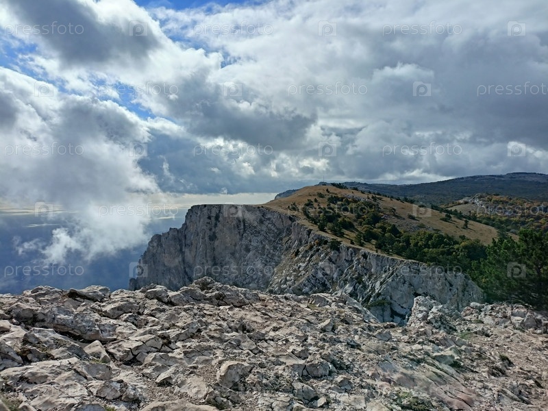 Каменное горное плато с крутыми скалами и драматическими облаками