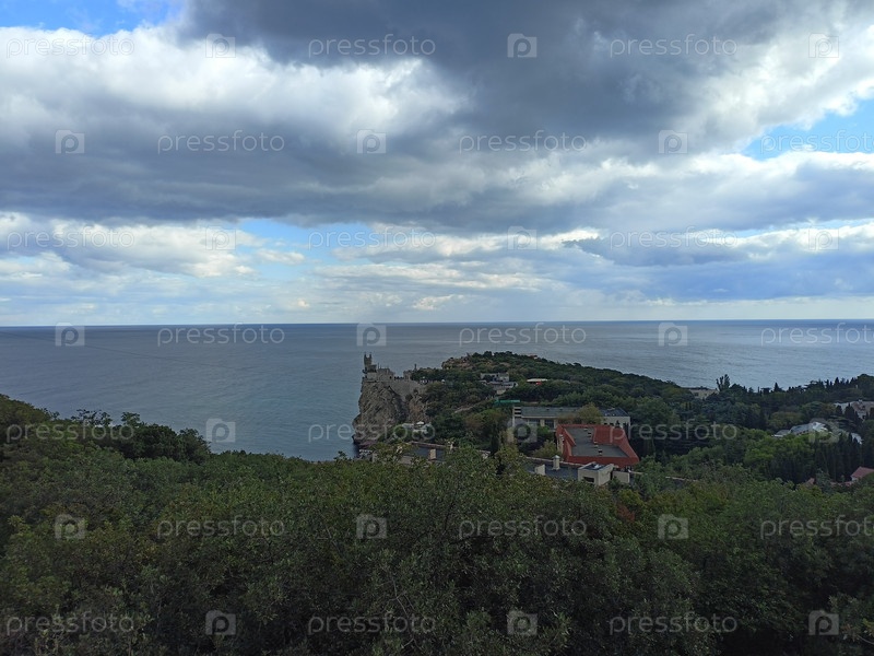Морской пейзаж с скалами, лесом и домами под драматическими облаками