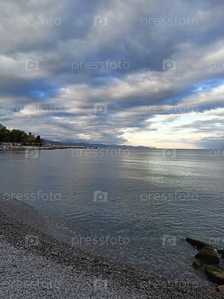 Спокойное море и галечный пляж под драматическими вечерними облаками