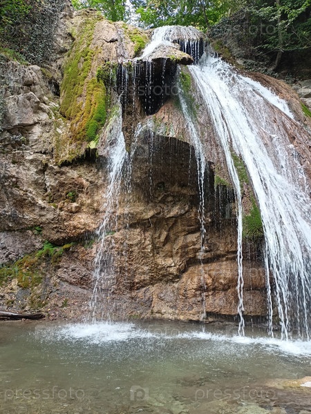 Горный водопад течет по скалам в прозрачный лесный бассейн
