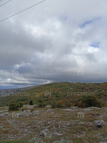 Горное плато с редкими деревьями под облаками сильного дождя