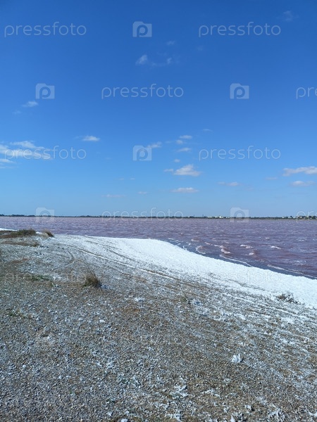 Розовое соленое озеро с белым берегом под ярко-синим небом