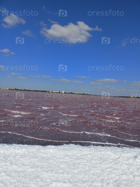Розовое соленое озеро с белым берегом под ярко-синим небом