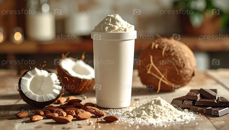 Тенденция здорового образа жизни с кокосовым протеиновым шейком в окружении натуральных ингредиентов, таких как миндаль, шоколад и кокос, представляющих концепцию органического питания