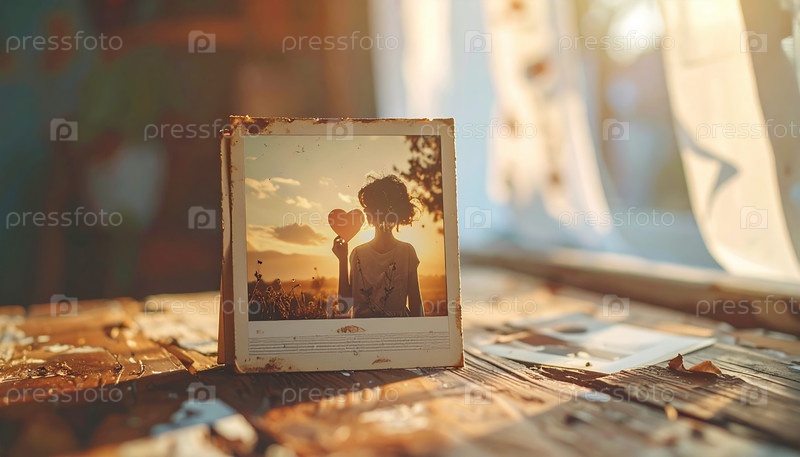 Винтажная фотография женщины, держащей свое сердце на закате, символизирующая ностальгию любви и памяти в теплом свете, идеально подходит для дня святого Валентина или романтической темы повествования