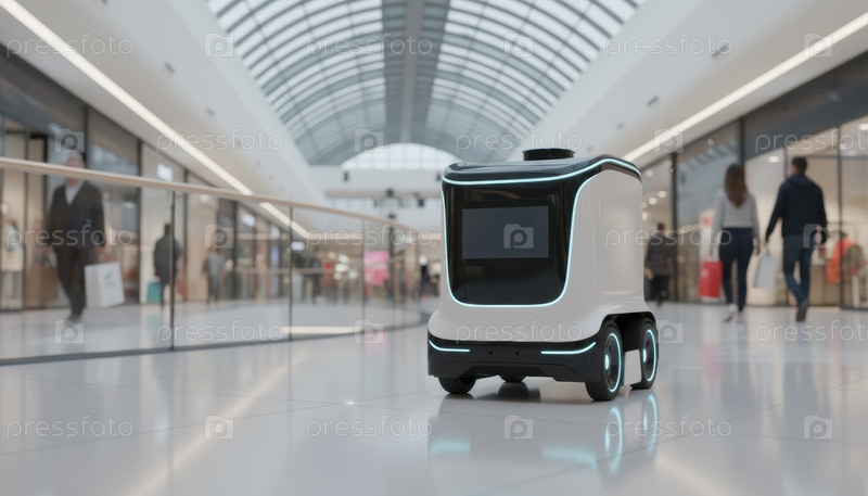 Футуристический робот доставки в торговый центр для инновационных историй, тенденций автоматизации розничной торговли и концепции технологий умного города
