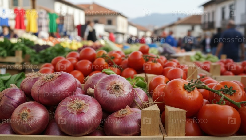 Свежие красные луки и помидоры заполняют деревянные коробки на открытом сельском рынке, отмечая местное сельское хозяйство, средиземноморскую кухню, летний урожай и медленный туризм