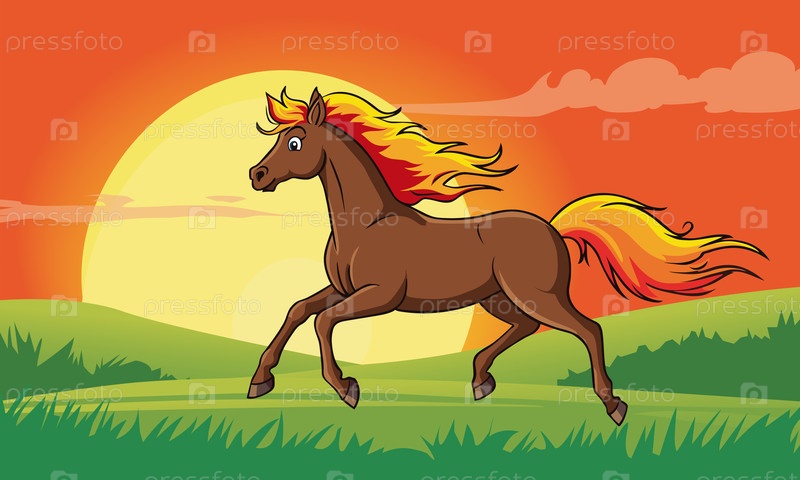 Иллюстрация красного огненного коня, бегущего по полям при закате солнца