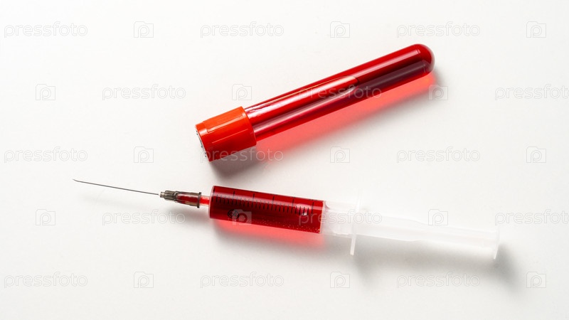 Шприц с красной жидкостью в нем сидит на белом фоне
