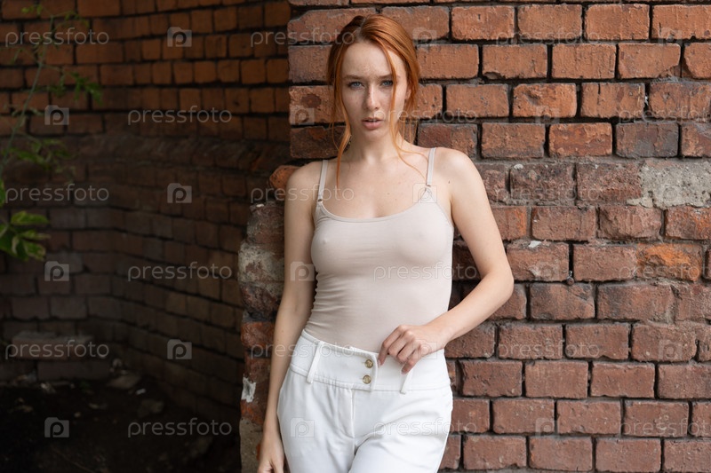 Портрет красивой молодой женщины с рыжими волосами возле кирпичной стены на улице