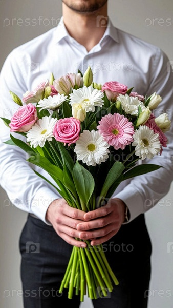 Мужчина в белой рубашке с букетом гербера в руках