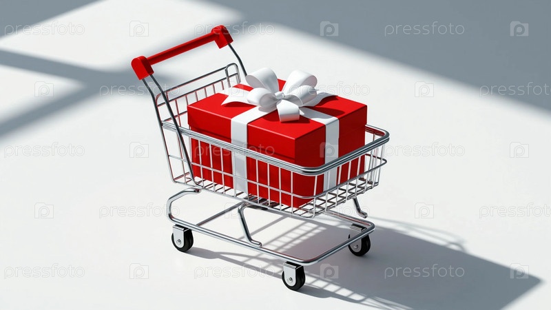 В металлической тележке лежит подарочная коробка на светлом фоне