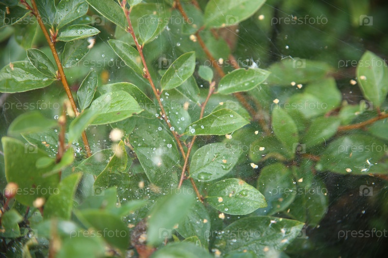 Декоративный куст с ягодами, паутинами и росой на улице