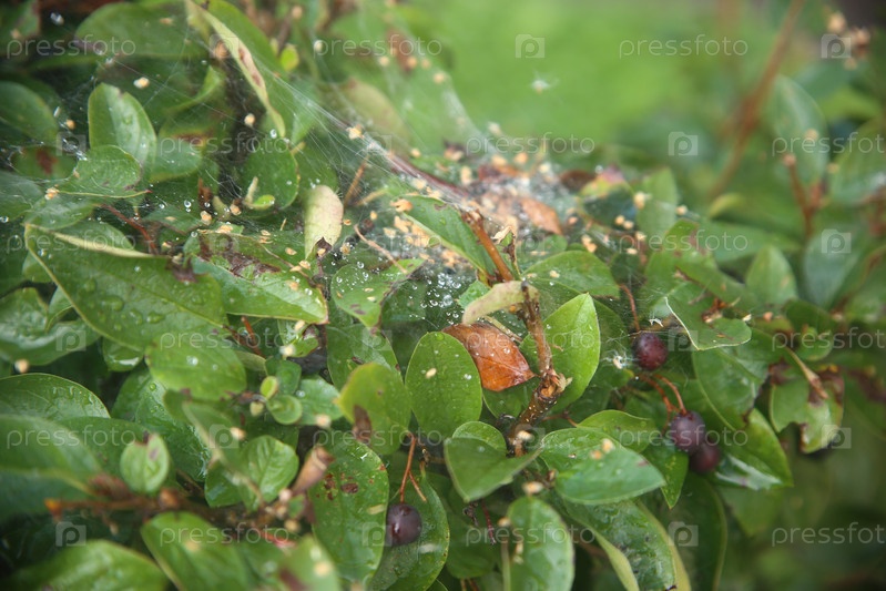 Декоративный куст с ягодами, паутинами и росой на улице